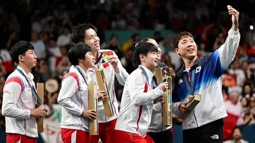 △巴黎奧運會乒乓球混合雙打頒獎儀式結束后,中朝韓運動員聚到一起合影的場景,在朋友圈刷了屏。