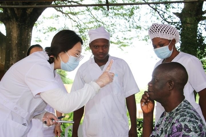 2024年6月6日,在貝寧阿波美中心醫(yī)院,中國第27批援貝寧醫(yī)療隊醫(yī)生為當?shù)鼐用窈Y查眼科疾病。新華社發(fā)(塞拉芬攝)