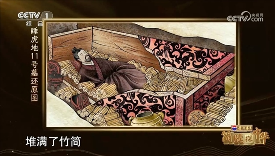 1975年底,考古學(xué)家在云夢縣睡虎地發(fā)掘出12座戰(zhàn)國晚期至秦代的墓葬。隨著11號秦墓的開啟,人們驚奇地看見,千余片竹簡層層疊壓,有序擺放在墓主人周圍,竹簡上的字跡清晰可見,這是中國考古史上首次發(fā)現(xiàn)的秦簡。