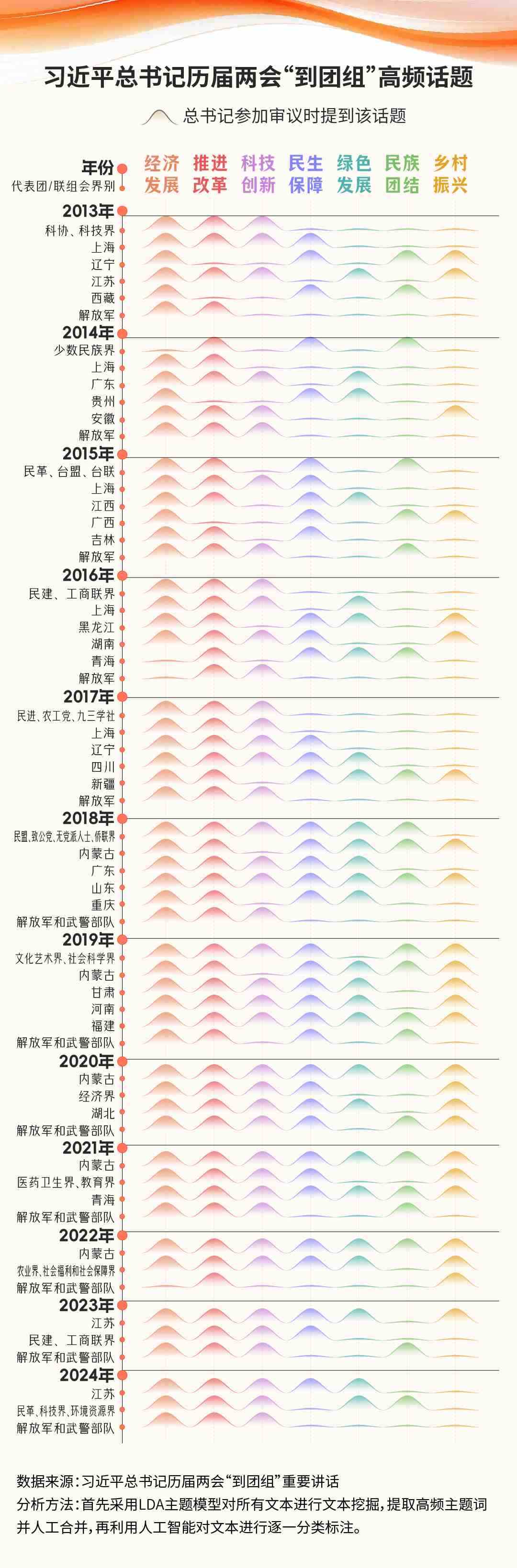 習近平總書記最經(jīng)常去哪些團組?從數(shù)據(jù)分析結果來看,總書記心系軍隊建設,12年12次到訪解放軍/解放軍和武警部隊代表團,每年“到團組”的最后一站都是參加軍隊代表團的審議。