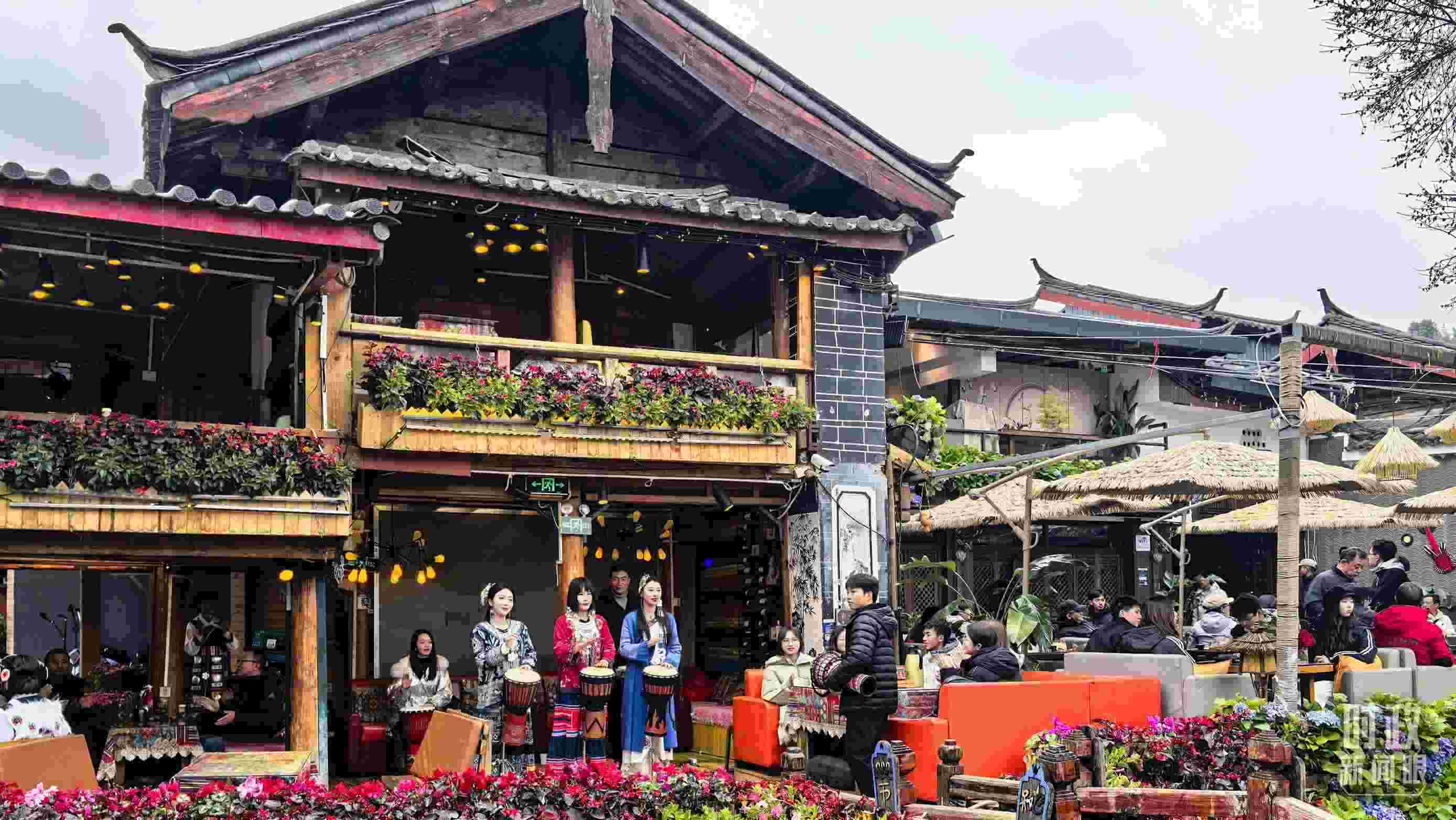 △古城商鋪門口的手鼓演奏。(總臺(tái)央視記者鄂介甫拍攝)