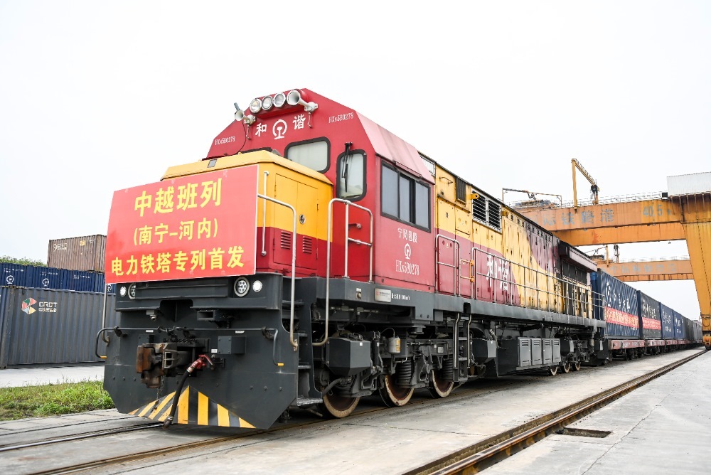 2024年3月8日,在廣西南寧國(guó)際鐵路港,電力鐵塔專列準(zhǔn)備發(fā)車(chē)。當(dāng)日,一列滿載340噸電力鐵塔的中越班列從南寧國(guó)際鐵路港開(kāi)出,發(fā)往越南河內(nèi)。新華社記者 曹祎銘 攝