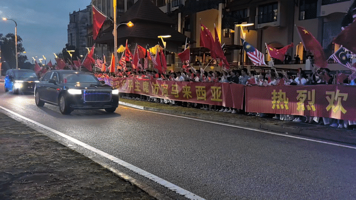 習(xí)近平乘車從機(jī)場赴下榻飯店途中,當(dāng)?shù)刂匈Y企業(yè)人員、留學(xué)生在道路兩旁揮舞中馬兩國國旗,高舉“熱烈歡迎習(xí)近平主席訪問馬來西亞”、“中馬友誼萬歲”等紅色橫幅,華僑華人表演喜慶熱烈的舞獅,歡迎習(xí)近平到訪。