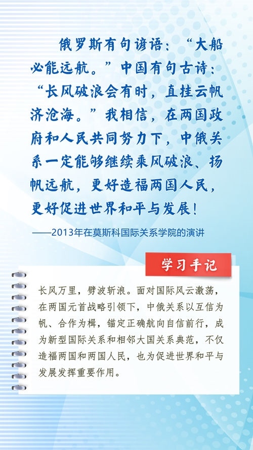 我們一起來(lái)學(xué)習(xí)品讀這些飽含哲思的論述,從中感悟新時(shí)代中俄關(guān)系在復(fù)雜的外部環(huán)境下堅(jiān)毅前行之道,感悟習(xí)近平主席作為大黨大國(guó)領(lǐng)袖、世界級(jí)領(lǐng)袖的時(shí)代擔(dān)當(dāng)與天下情懷。