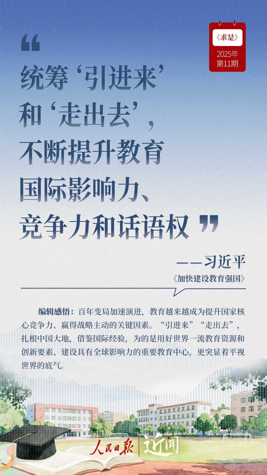 教育是國之大計(jì)、黨之大計(jì)。日前,《求是》雜志發(fā)表習(xí)近平總書記重要文章《加快建設(shè)教育強(qiáng)國》?!叭姘盐战逃恼螌傩?、人民屬性、戰(zhàn)略屬性”“讓教育改革發(fā)展成果更多更公平惠及全體人民”“讓教師享有崇高社會聲望、成為最受社會尊重的職業(yè)之一”……通過這些話,一起感悟習(xí)近平總書記對教育強(qiáng)國建設(shè)的謀劃與部署。