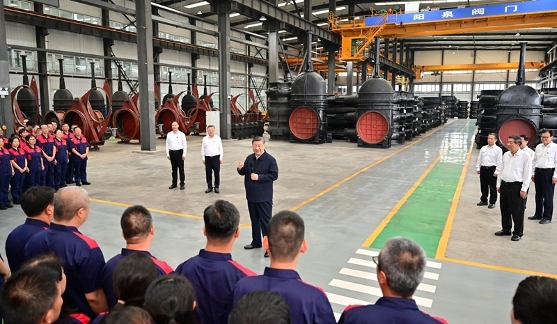 當天下午,習近平到陽泉閥門股份有限公司進行了考察。在聽取近年來山西省產業(yè)轉型升級情況匯報后,他走進企業(yè)生產車間,詳細了解煤氣閘閥、電動翻板閥等產品生產和銷售情況。他指出,傳統(tǒng)制造業(yè)是實體經(jīng)濟的重要組成部分,要把握市場需求,加強科技創(chuàng)新,讓傳統(tǒng)產業(yè)煥發(fā)新活力。他對企業(yè)員工們說,我國的工業(yè)發(fā)展,過去是靠一榔頭一錘子地敲,今天要靠先進技術和裝備來提升水平。實業(yè)興國,實干興邦。希望你們再接再厲、更上層樓,為建設制造強國多作貢獻。