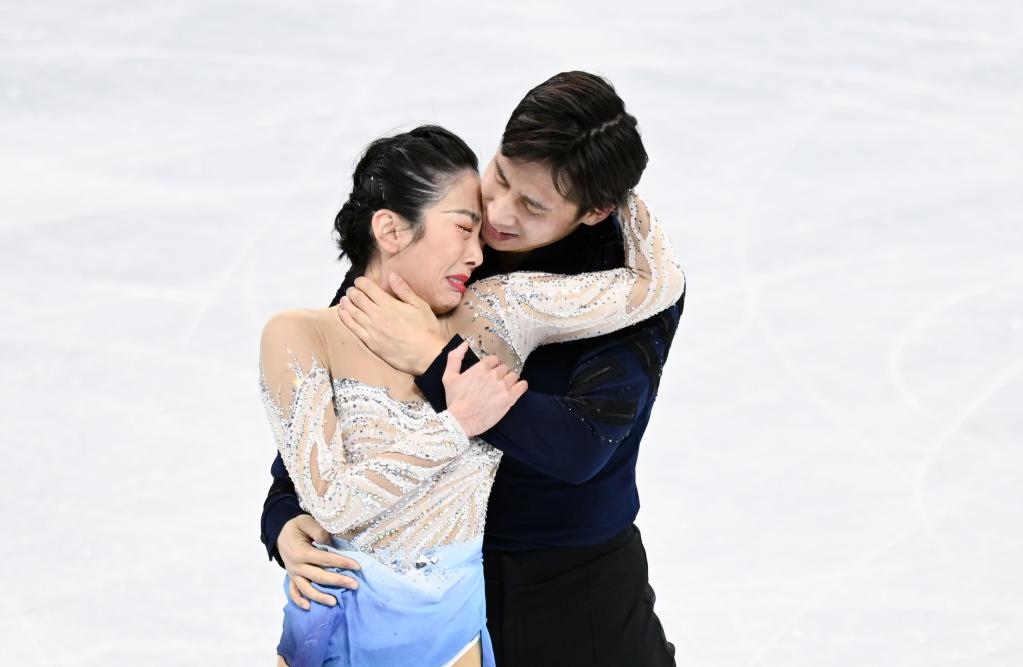 2月19日,中國選手隋文靜(左)/韓聰在2022年冬奧會(huì)花樣滑冰雙人滑比賽奪冠后。新華社記者李一博攝