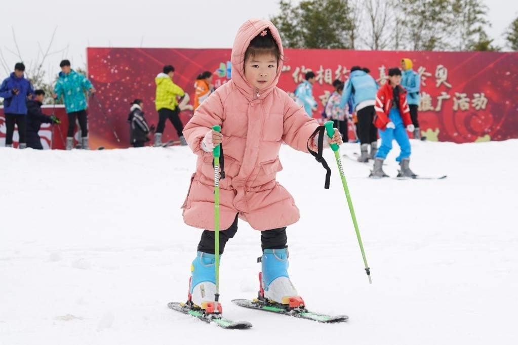 1月14日,小朋友在江蘇省淮安市古運(yùn)河滑雪場(chǎng)體驗(yàn)滑雪。新華社記者李博攝