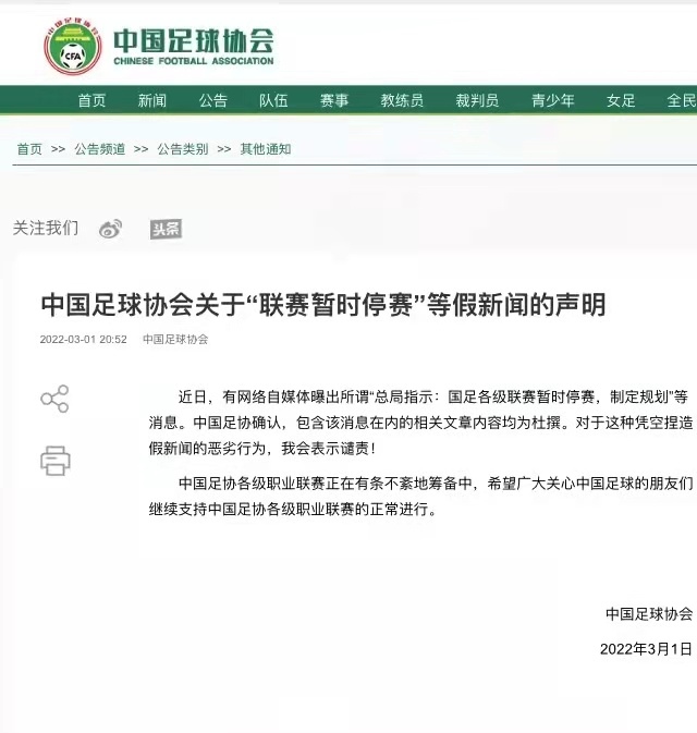 中國足協(xié):“聯(lián)賽暫時停賽”為假新聞