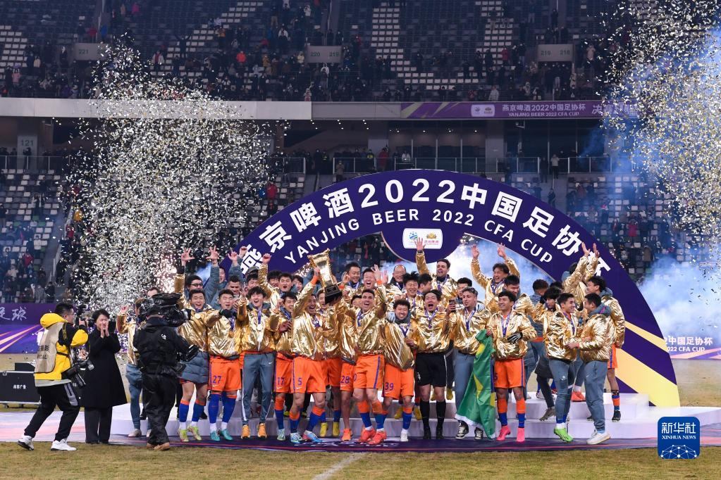 當日,在江蘇蘇州舉行的2022中國足協(xié)杯決賽中,山東泰山隊以2比1戰(zhàn)勝浙江隊,奪得冠軍。