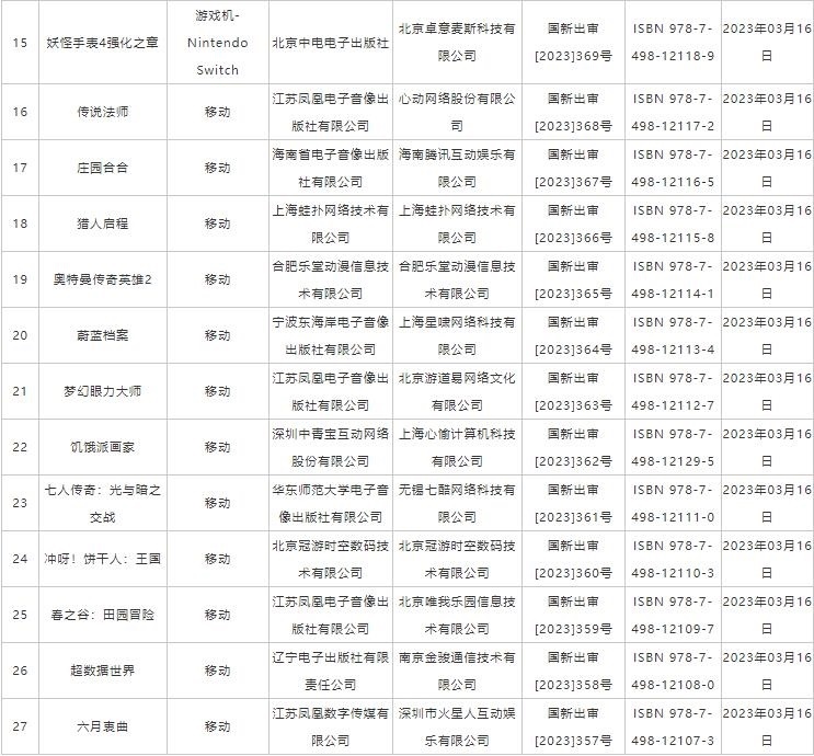 人民網(wǎng)北京3月21日電 (記者楊虞波羅)據(jù)國家新聞出版署官網(wǎng)消息,3月20日,2023年進口網(wǎng)絡(luò)游戲?qū)徟畔⒄桨l(fā)布,共27款游戲獲得游戲版號,其中包含22款移動游戲、3款PC游戲、1款雙端游戲、1款NS游戲機游戲。