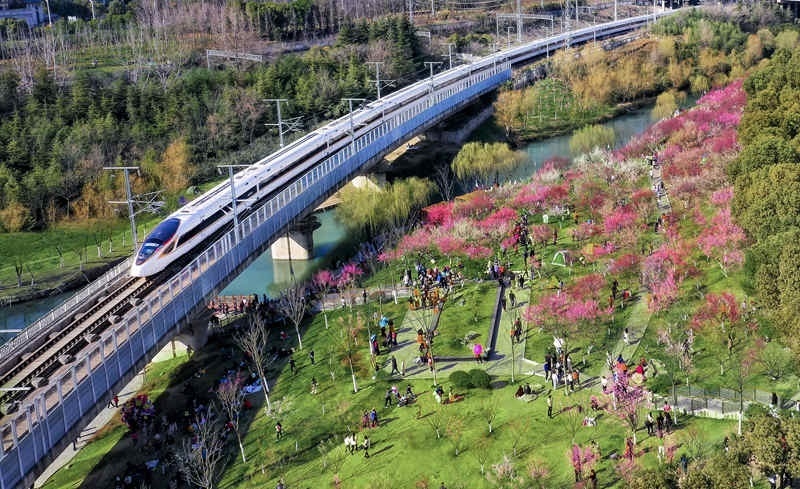 一列動車組列車從合肥市匡河公園邊駛過。中國鐵路上海局集團有限公司供圖
