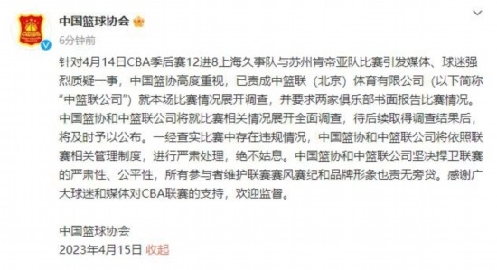 CBA聯(lián)賽官方微博15日凌晨發(fā)布消息表示:針對4月14日2022-2023賽季CBA聯(lián)賽季后賽12進8、上海久事隊與蘇州肯帝亞隊比賽引發(fā)媒體、球迷強烈質疑一事,中籃聯(lián)(北京)體育有限公司(以下簡稱“中籃聯(lián)公司”)高度重視,已就本場比賽情況展開調查,中國籃協(xié)也在第一時間責成中籃聯(lián)公司查明情況。中籃聯(lián)公司待后續(xù)取得調查結果后,將及時予以發(fā)布。