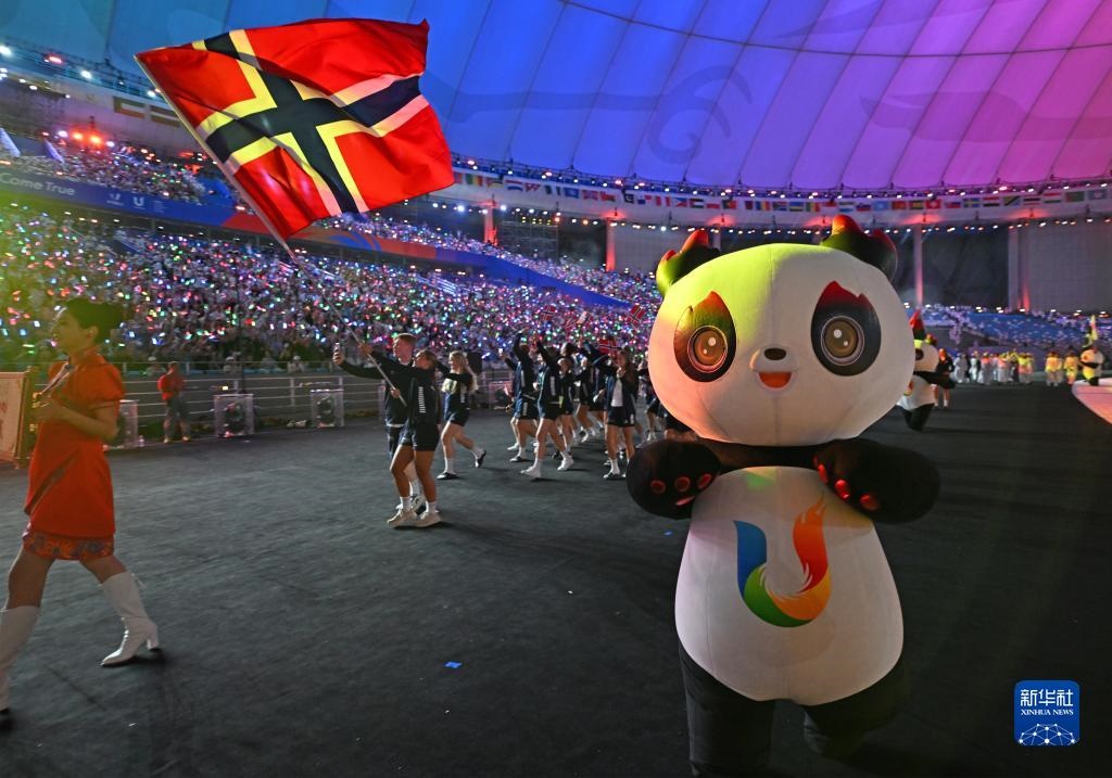 7月28日,挪威大學(xué)生體育代表團(tuán)在開(kāi)幕式上入場(chǎng)。