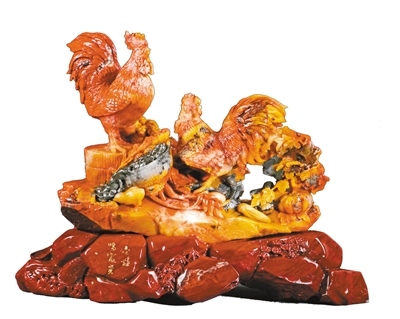 巴林石雕“金雞鳴富貴”。
