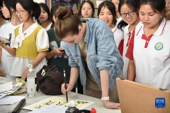 6月5日,參加三都高級中學(xué)第一屆國際文化節(jié)的來華留學(xué)生學(xué)習(xí)書寫水族文字。