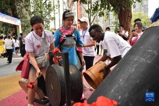 6月5日,參加三都高級中學(xué)第一屆國際文化節(jié)的來華留學(xué)生體驗敲擊銅鼓。