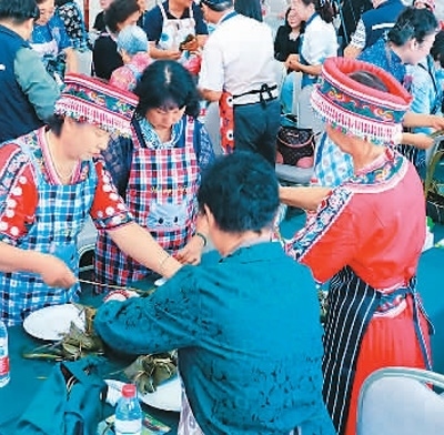 圖為京臺(tái)兩地同胞一同體驗(yàn)包粽子。北京市臺(tái)辦供圖