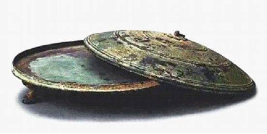 青銅鏊由蓋和體兩部分組成,蓋呈傘狀,上飾兩組弦紋,頂部有一橋形鈕,鈕下飾以梅花形飾片,鈕上套一圓形提環(huán)。體為圓形淺盤,平底,下附三蹄足。蓋周邊有和鏊面扣合的子母口,上下合體十分嚴(yán)密。據(jù)考證,這是我國考古發(fā)現(xiàn)最早的帶蓋青銅鏊,是研究古代飲食文化的珍貴實(shí)物資料。
