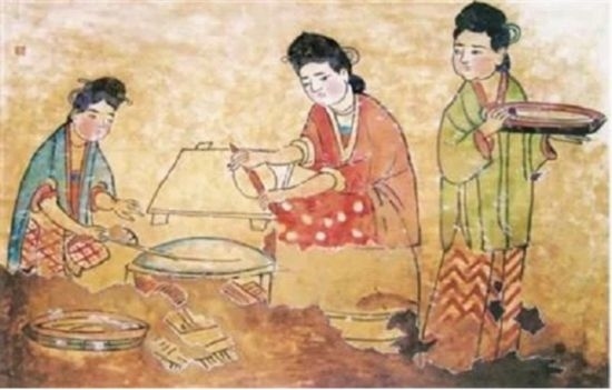 2003年,河南省登封市高村發(fā)掘了一座宋代壁畫墓,其中的“烙餅圖”非常生動寫實(shí)。畫中有3位女子,左側(cè)女子正在鏊子前持物翻餅,其右置一圓盒,內(nèi)有烙好的煎餅。鏊子呈穹廬狀鼓起,同現(xiàn)在常見的鐵鏊無異。中間女子正在矮案前持兩頭尖、中間粗的搟面棍搟制面皮。右側(cè)女子雙手托盤,似走卻又回首觀望。整幅壁畫色彩艷麗,人物各具情態(tài),栩栩如生。