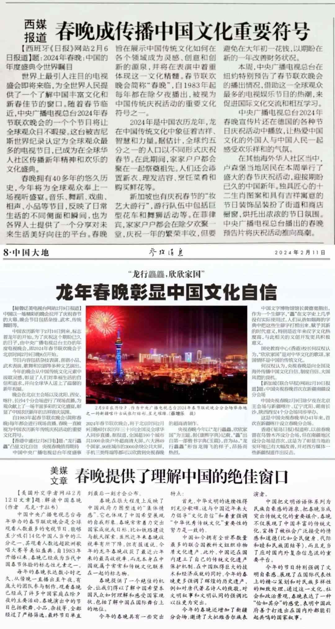 《參考消息》援引西班牙媒體評論稱,總臺龍年春晚為全世界人民提供了一個(gè)了解中國豐富文化的窗口,它展示中國傳統(tǒng)文化如何在各個(gè)領(lǐng)域成為靈感、創(chuàng)意和創(chuàng)新的源泉,并在音樂、舞蹈、戲曲等節(jié)目中體現(xiàn)傳統(tǒng)文化的精髓。秘魯、新加坡等媒體報(bào)道稱,龍年春晚彰顯了中國的文化自信。而美國《外交學(xué)者》網(wǎng)站署名文章認(rèn)為,龍年春晚為世界提供了理解中國的絕佳窗口。海外媒體的這些報(bào)道,不約而同地使用了“文化符號”“標(biāo)志性元素”等詞匯,并從促進(jìn)文化理解、推動(dòng)文化交流等角度對總臺春晚的海外影響力進(jìn)行解讀。