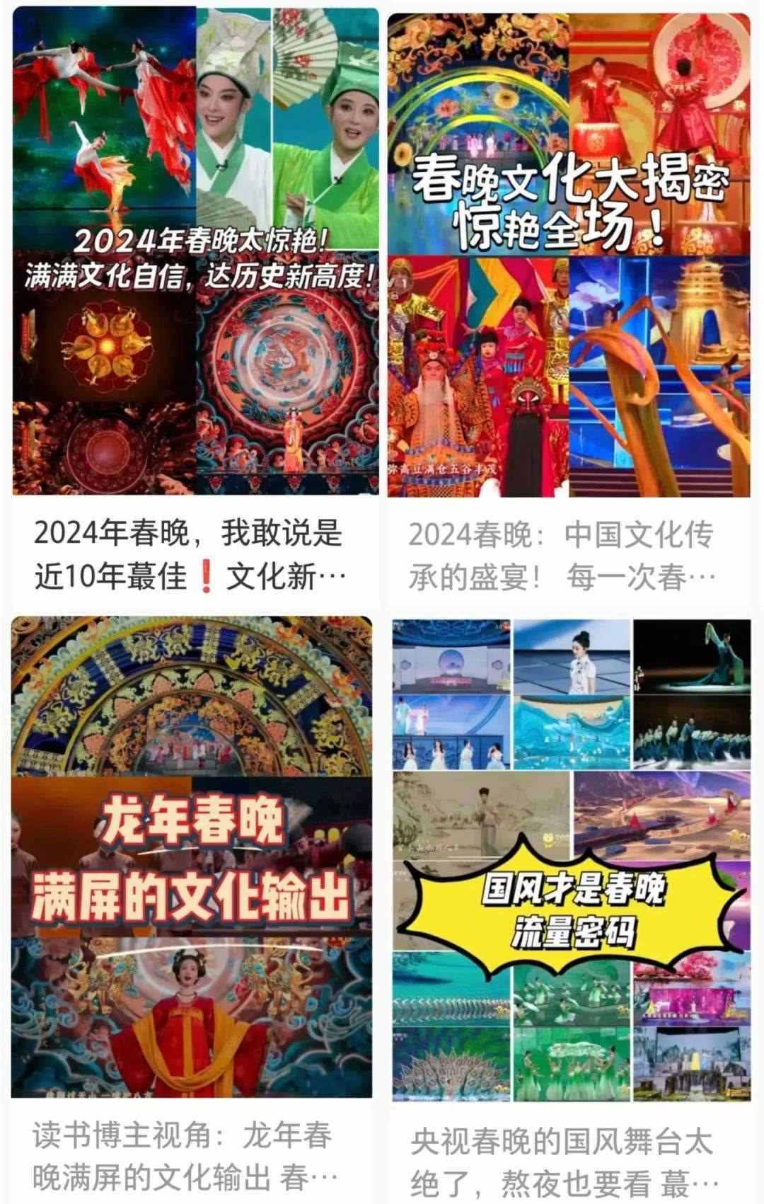 春晚的文化展現(xiàn),在國人中也引起了熱烈反響。“每一個(gè)文化類節(jié)目都蘊(yùn)含著獨(dú)特的中國之美,這種美有的跨越千年,有的多經(jīng)磨難,春晚給我們呈現(xiàn)了一場場宏大的視聽盛宴,作為觀眾很難不動(dòng)容”“從今年春晚真真切切地感受到了文化自信,大好河山,傳統(tǒng)文化,國家強(qiáng)盛,美美與共”“文化傳統(tǒng)特色給各個(gè)節(jié)目都刷了創(chuàng)意的漆,霸氣從節(jié)目中升騰,自信從感嘆中生發(fā),真妙”......