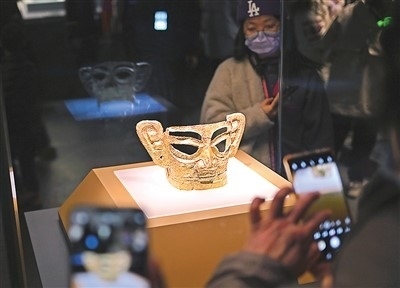 2月15日,上海博物館東館,觀眾參觀“星耀中國(guó):三星堆·金沙古蜀文明展”上的金面具。新華社記者 劉 穎攝