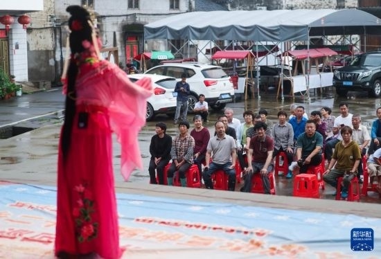 6月25日,澧浦鎮(zhèn)鄭店村百姓在觀看光南文化禮堂大舞臺上婺之靈坐唱班表演的婺劇(無人機照片)。