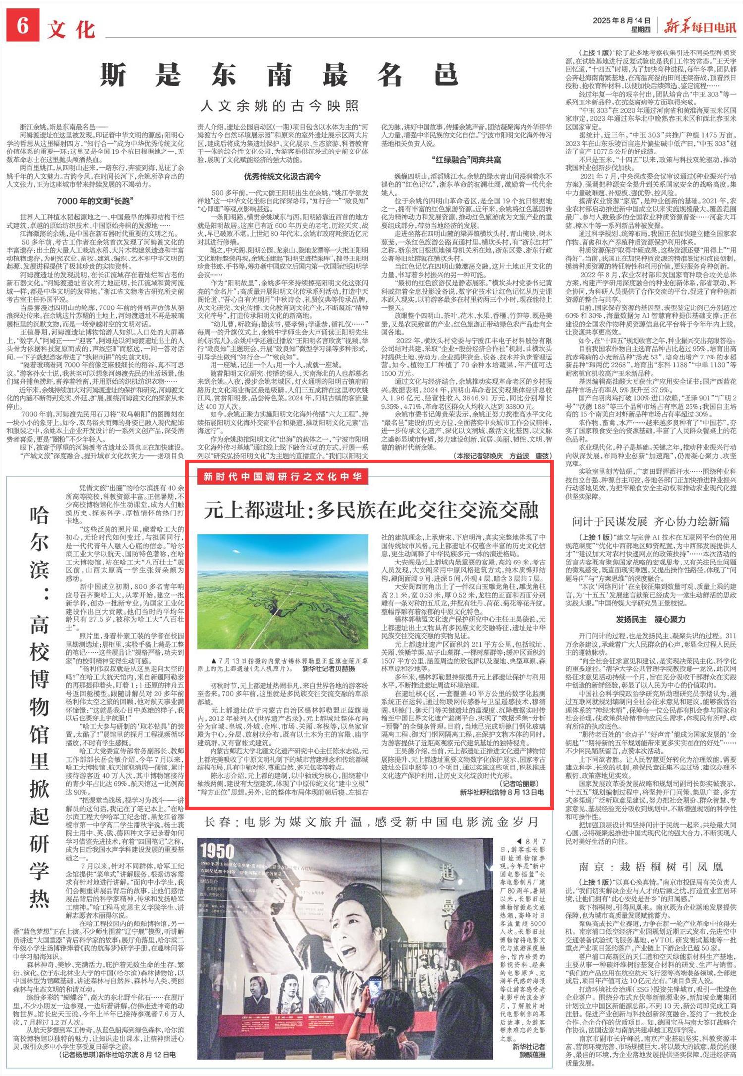 2025年8月14日,《新華每日電訊》第6版刊發(fā)題為《元上都遺址:多民族在此交往交流交融》的文章,報道了初秋時節(jié),元上都遺址熱鬧非凡,來自世界各地的游客紛至沓來。元上都遺址出土文物具有多民族文化交融特征,遺址是中華民族交往交流交融的實物見證。