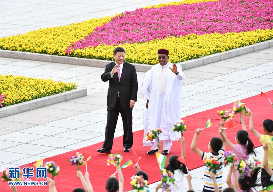 5月28日,國(guó)家主席習(xí)近平在北京人民大會(huì)堂同尼日爾總統(tǒng)伊素福舉行會(huì)談。這是會(huì)談前,習(xí)近平在人民大會(huì)堂東門外廣場(chǎng)為伊素福舉行歡迎儀式。
