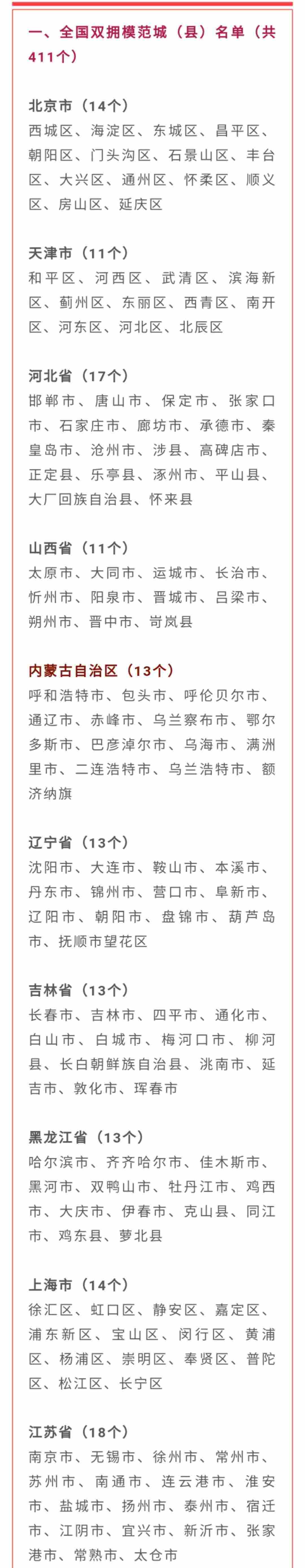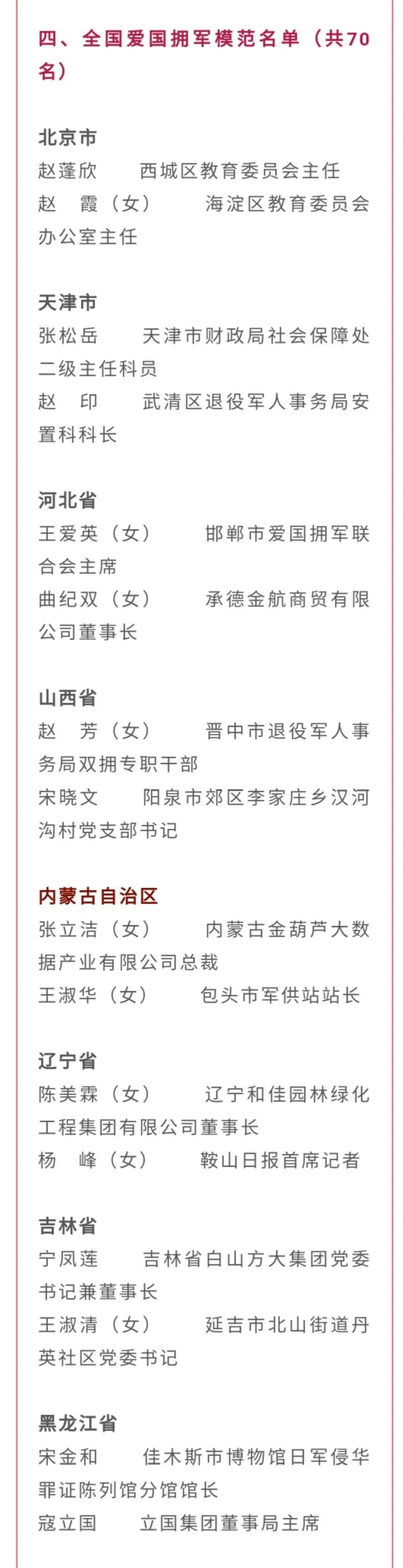 10月20日,全國雙擁模范城(縣)命名暨雙擁模范單位和個人表彰大會在北京舉行,大會宣讀了關于命名411個全國雙擁模范城(縣),關于表彰全國愛國擁軍模范單位和擁政愛民模范單位,關于表彰全國愛國擁軍模范和擁政愛民模范的決定。內(nèi)蒙古自治區(qū)13個市縣(旗)榮膺全國雙擁模范城(縣),1個鎮(zhèn)、2名全國愛國擁軍模范受到表彰。全部名單如下: