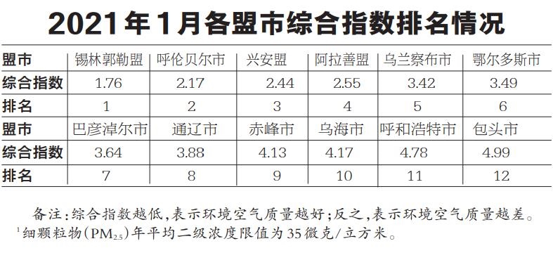 2021年1月,全區(qū)環(huán)境空氣質(zhì)量?jī)?yōu)良天數(shù)比例平均為79.3%,同比提高10.7個(gè)百分點(diǎn)。12個(gè)盟市優(yōu)良天數(shù)比例由高至低依次為:呼倫貝爾市(100.0%)、錫林郭勒盟(100.0%)、興安盟(100.0%)、赤峰市(90.3%)、烏蘭察布市(83.9%)、阿拉善盟(80.6%)、通遼市(77.4%)、鄂爾多斯市(74.2%)、呼和浩特市(67.7%)、包頭市(64.5%)、烏海市(61.3%)和巴彥淖爾市(51.6%)。