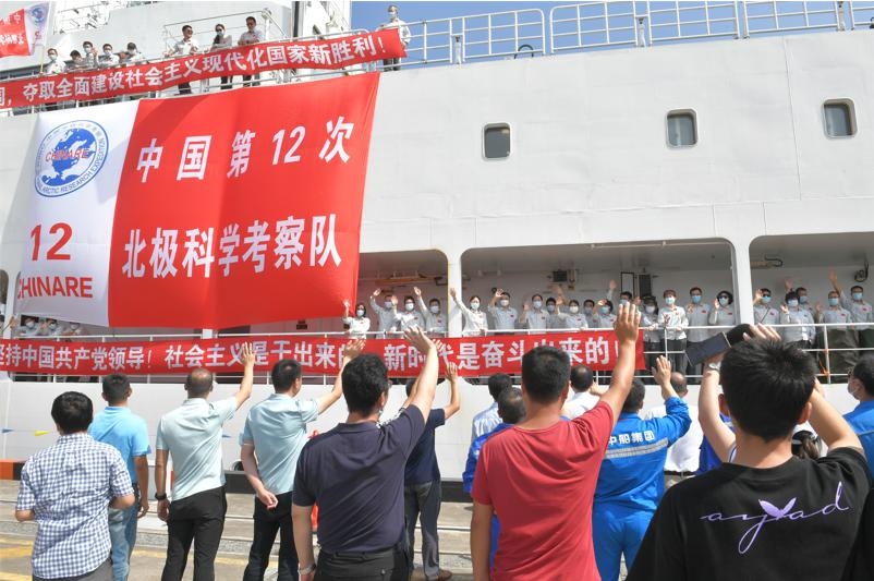 人們?cè)谏虾?guó)內(nèi)基地碼頭歡迎“雪龍2”號(hào)科考破冰船返航。自然資源部供圖