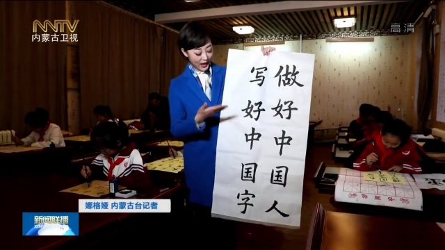 娜格婭 內(nèi)蒙古臺記者:做好中國人,寫好中國字,你能想到我手中的這些字,是一個四年級小朋友寫的嗎?我現(xiàn)在是在呼和浩特鋼鐵路第二小學的興趣課上,學生們正在學習寫毛筆字,一筆一劃傳承書法文化,一撇一捺書寫著愛國情懷。像這樣的興趣課每周有一次。