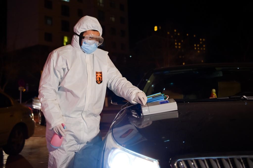 12月7日,在滿(mǎn)洲里市現(xiàn)代花園小區(qū),志愿者王力豐在核對(duì)居民信息。新華社記者李志鵬 攝