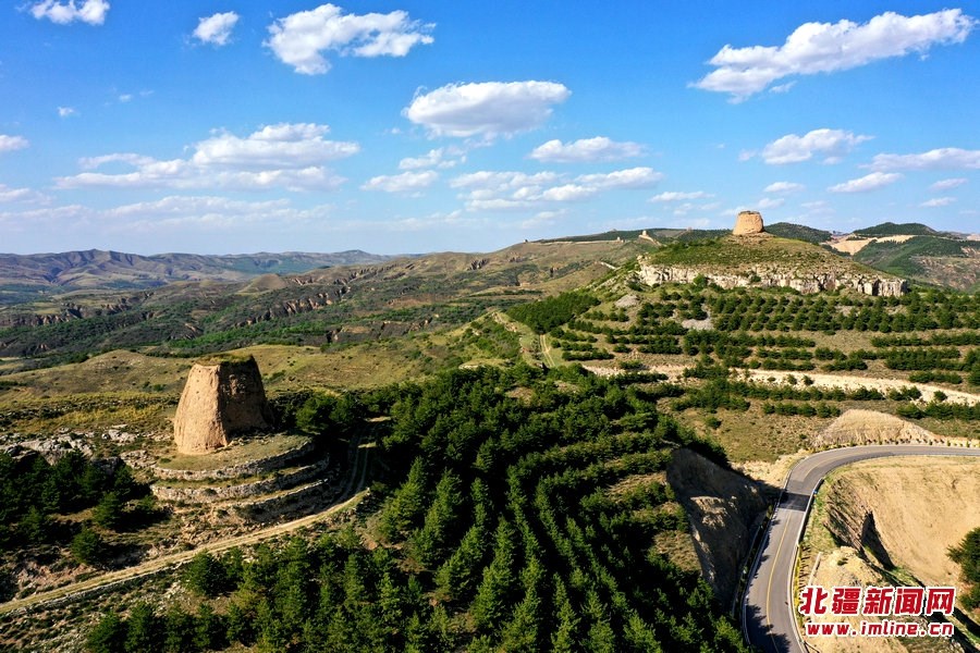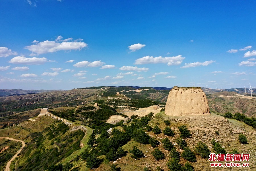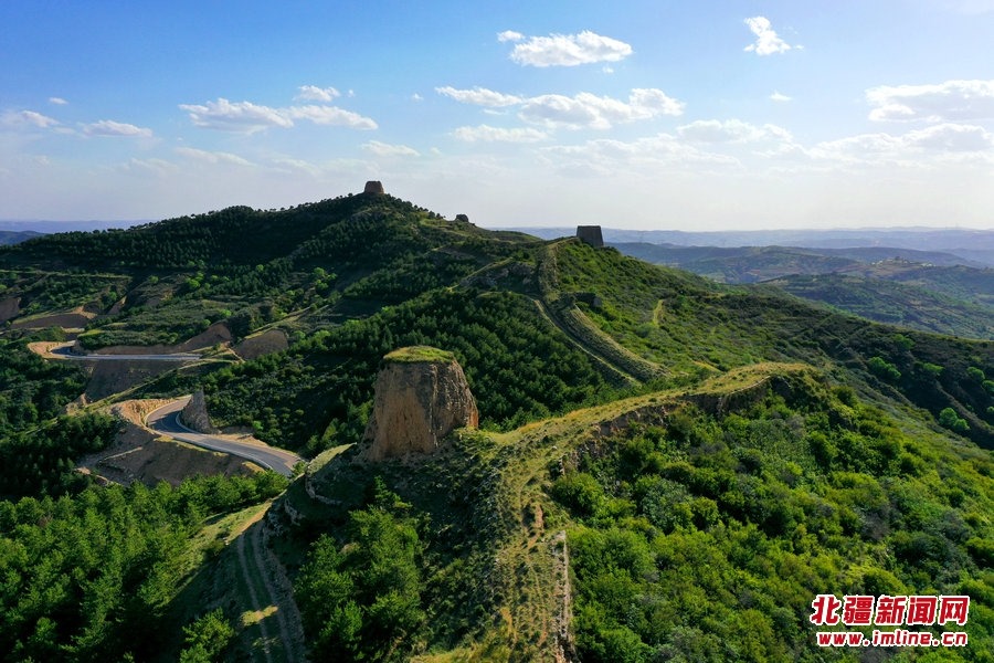 端午時(shí)節(jié),由G209國(guó)道岔口至老牛坡的公路正在緊張建設(shè)中。汽車沿著剛剛鋪好軟基的砂石路面行進(jìn),車窗外,高高低低的烽火墩臺(tái)聳立在山巒之上,巍峨雄偉,座座墩臺(tái)直沖云霄,蔚為壯觀。清水河縣明長(zhǎng)城國(guó)家文化公園的核心區(qū)小元峁段長(zhǎng)城(栜木塔長(zhǎng)城)即位于此。