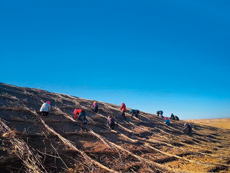 杭錦旗群眾在沙丘上栽設(shè)固沙沙障 杭錦旗委宣傳部供圖