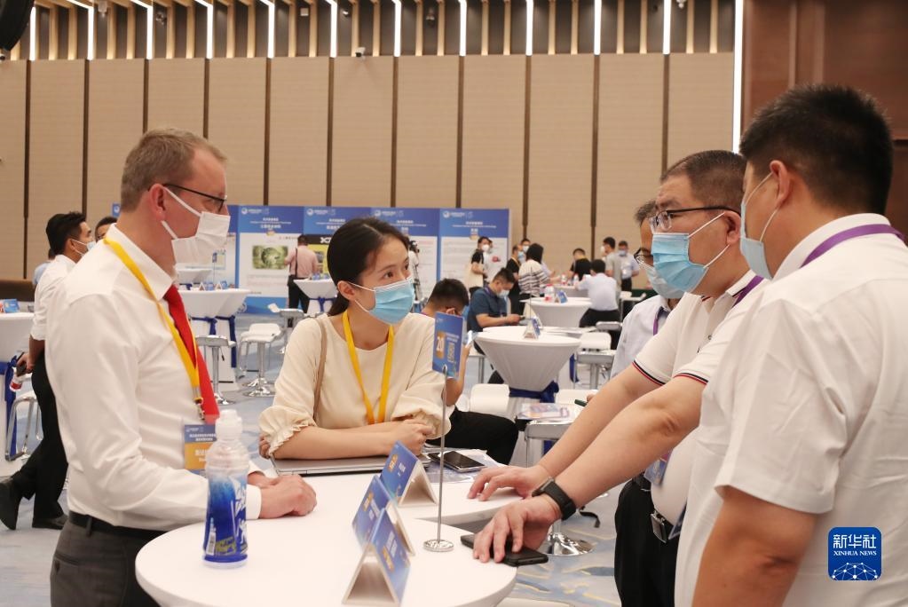 第五屆進(jìn)博會技術(shù)裝備展區(qū)展前供需對接會在上海舉行。這是參展商代表(前左二)在對接會上向采購商介紹企業(yè)產(chǎn)品情況(2022年8月8日攝)。新華社記者 方喆 攝