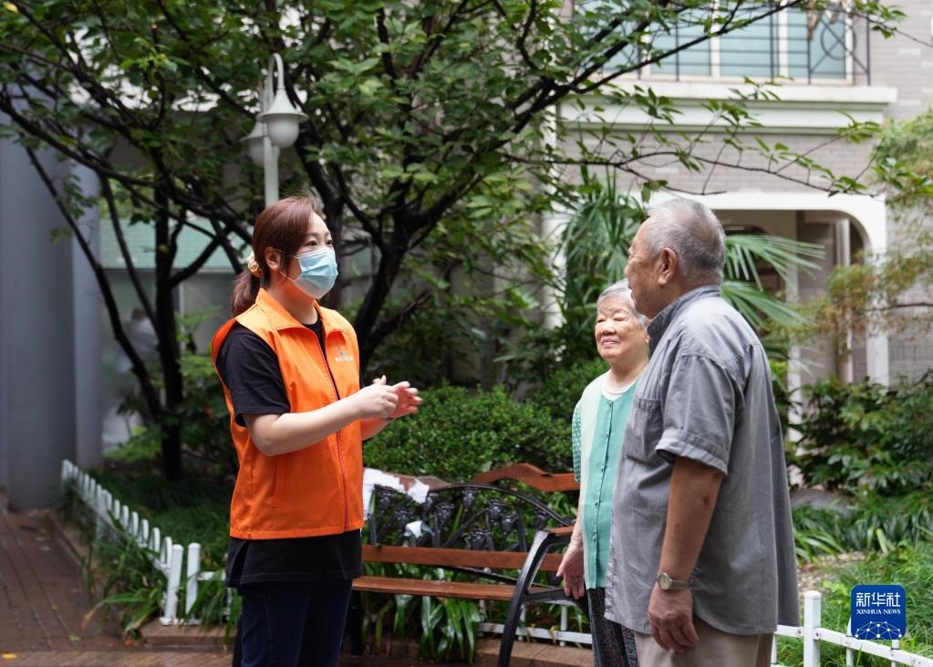 在上海靜安區(qū)石門二路街道新??道铮用駞^(qū)黨總支書記魏瑛(左)在和居民交流(2022年9月15日攝)。新華社記者 劉穎 攝