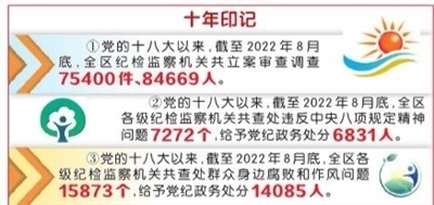 數(shù)據(jù)顯示,黨的十八大以來,截至2022年8月底,全區(qū)紀(jì)檢監(jiān)察機(jī)關(guān)立案審查調(diào)查75400件、84669人,做到有腐必反、除惡務(wù)盡,推動政治生態(tài)持續(xù)向上向好。