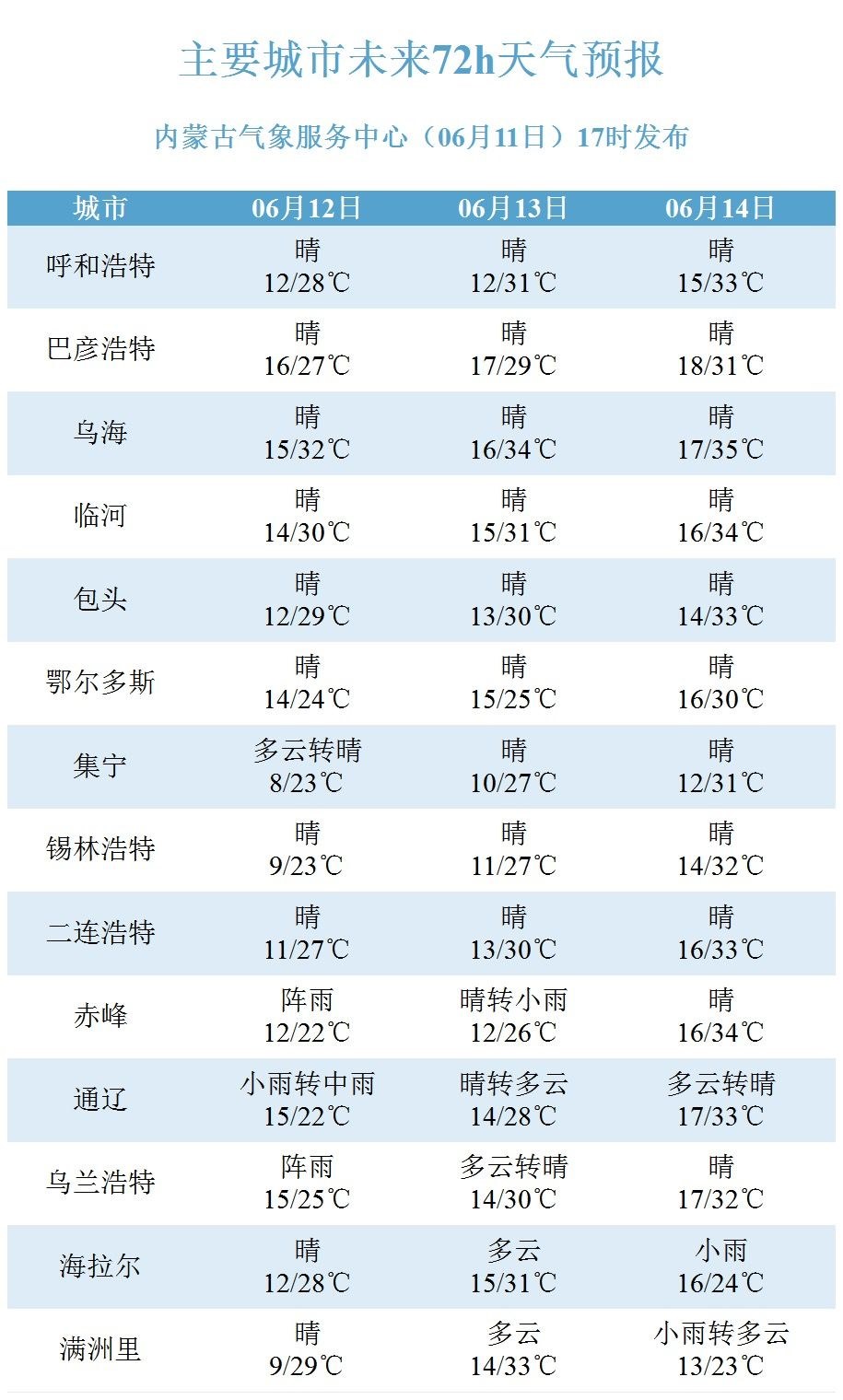 具體天氣預(yù)報(bào)為:12日白天到夜間,內(nèi)蒙古中部偏東和東部大部地區(qū)多云,其中,錫林郭勒盟東部、赤峰市、通遼市、興安盟大部、呼倫貝爾市南部部分地區(qū)有小雨或雷陣雨,上述地區(qū)可能伴有短時(shí)強(qiáng)降水、雷暴大風(fēng)等強(qiáng)對流天氣,其余地區(qū)晴間多云;內(nèi)蒙古西部偏西和中部偏東地區(qū)4~5級東南風(fēng)或偏北風(fēng);阿拉善盟西北部局地有35℃以上的高溫天氣。
