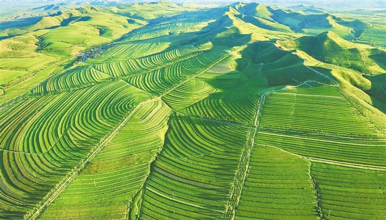 如今,薩力巴萬畝梯田、豐收萬畝梯田、新地萬畝梯田在敖漢旗大地依次呈現(xiàn),全旗梯田保存面積達120萬畝,將中部丘陵地區(qū)“雞爪子溝”劃出的貧窮“等高線”變作群山出金、河流淌銀的“米糧川”。