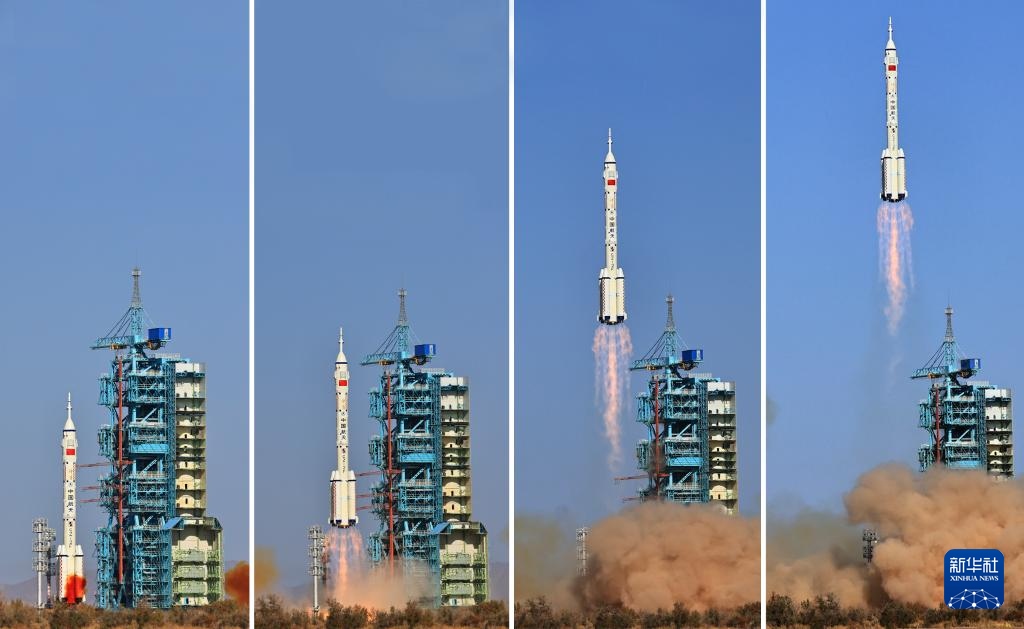這是神舟十七號載人飛船發(fā)射升空過程(拼版照片,10月26日攝)。