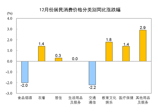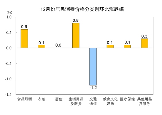 12月份,全國居民消費價格環(huán)比上漲0.1%。其中,城市上漲0.1%,農(nóng)村上漲0.1%;食品價格上漲0.9%,非食品價格下降0.1%;消費品價格上漲0.1%,服務價格上漲0.1%。