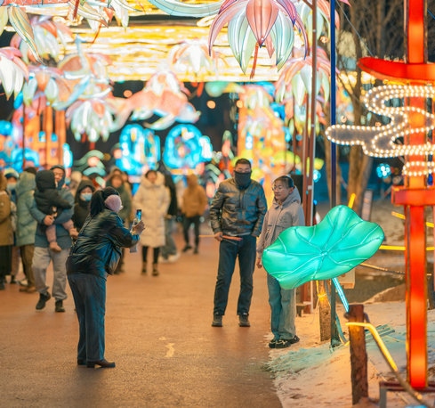 當晚,呼和浩特零下15攝氏度左右,寒冷擋不住市民欣賞流光溢彩的燈會,只見市民穿著保暖的外套,戴著帽子手套,一邊逛燈會,一邊拍照片、拍視頻,還有的市民開直播,與全國各地的網(wǎng)友一起分享這美好時刻。