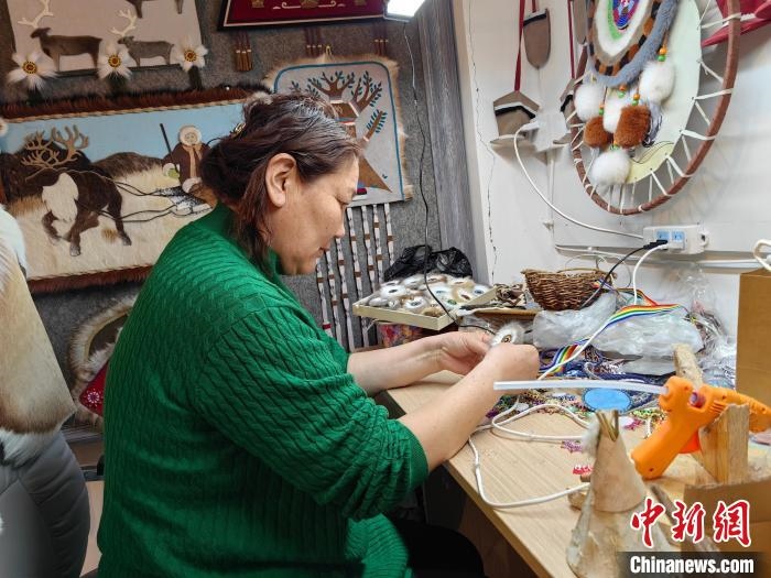 2月21日,在內(nèi)蒙古呼倫貝爾市鄂溫克族自治旗一家手工藝品工作室內(nèi),烏仁在制作太陽(yáng)花手工藝品?!  ∮诩? 攝