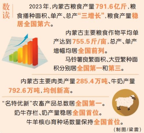 數(shù)字是發(fā)展最好的注腳。過去一年,內(nèi)蒙古緊扣“地、水、種”和“糧、肉、奶”6個重點(diǎn),全力推動糧食單產(chǎn)再提高、牲畜養(yǎng)殖再增效,不斷擴(kuò)大數(shù)量、提高質(zhì)量、增加產(chǎn)量,努力把國家重要農(nóng)畜產(chǎn)品生產(chǎn)基地建設(shè)得量大質(zhì)優(yōu),切實(shí)當(dāng)好國家糧食安全“壓艙石”。