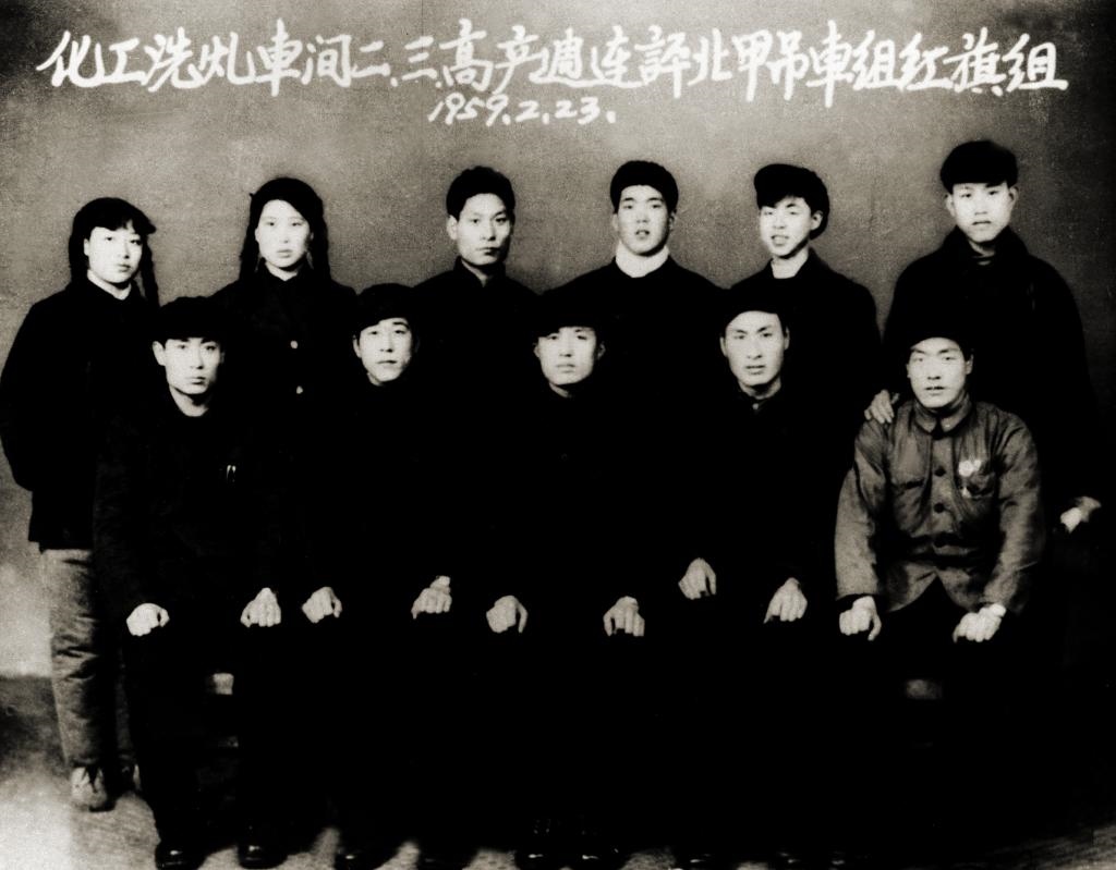 ↑1959年2月,雷鋒所在鞍鋼洗煤車間吊車組被評(píng)為紅旗組,這是雷鋒(后排右二)和工友合影。