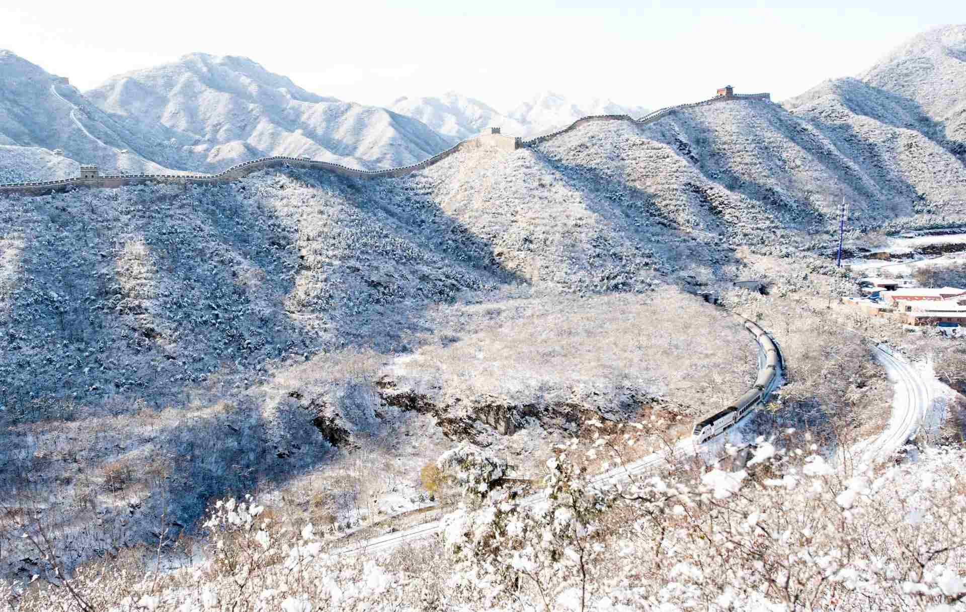 白雪皚皚,北京居庸關(guān)長(zhǎng)城銀裝素裹綿延于山脊之上。山腳下,S2線列車迎面而來穿越雪海。