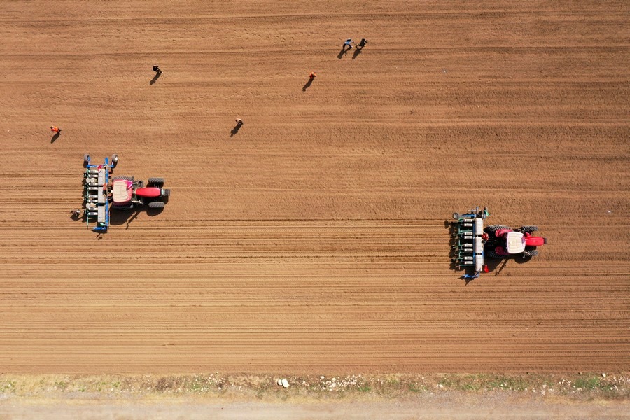 空中俯瞰自動(dòng)導(dǎo)航無(wú)人駕駛農(nóng)機(jī)具 北疆新聞?dòng)浾?張楊攝影